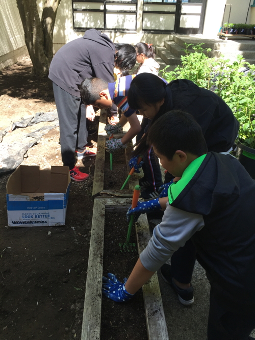 Di tahun pertama, saya mencoba-coba cara untuk menanfaatkan ruangan-ruangan yang ada di perpustakaan sekolah dengan sebaik-baiknya. Taman ini adalah proyek pertama kami dalam proses transformasi. Biaya transformasi perpustakaan ini ditanggung oleh instansi atau lembaga pendanaan atau subsidi (detailnya akan dibahas nanti). Bekerja sama dengan setiap ruang kelas, kami mengambil alih sebuah ruangan yang dulunya digunakan sebagai tempat penyimpanan barang dan membuat taman. Masing-masing siswa mengangkut tanah dan batu menggunakan ember kecil. Mereka menggali, menanam, dan menyapu dengan garpu taman, dan menyiangi tamannya bersama. Kami juga bersama-sama menanam pakis dan bunga, membangun jalan setapak berkerikil, menghias taman dengan meja kayu dan bantal, dan bahkan membuat taman pasir Zen (Zen garden) mini ala Jepang. Taman ini kemudian menjadi ciri khas dari perpustakaan sekolah dan tempat favorit siswa untuk membaca, bekerja, dan berkebun.