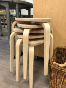 Dalam proses perencanaan tempat belajar yang baru dan fleksibel ini, kami mempertimbangkan setiap detail dalam perencanaan kami. Contohnya, kami memilih kursi bar dibandingkan kursi biasa pada umumnya: ringan dan mudah ditumpuk sehingga tidak memakan tempat. Troli beroda memiliki mobilitas yang tinggi dan memungkinkan ruangan untuk bertransformasi menjadi beragam ruangan. Warna cat yang berasal dari warna earth tone (warna yang berasal dari elemen-elemen yang ada di bumi) menggambarkan bumi, air, dan tanah.