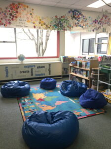Sedangkan di bagian dalam perpustakaan, kami memasang karpet baru untuk menutupi karpet lama yang sudah usang sehingga bisa membuat suasana di dalam ruang perpustakaan menjadi jauh lebih nyaman. Prioritas kami adalah menciptakan ruangan yang nyaman dan bersahabat karena ini sebenarnya adalah permintaan para siswa sendiri berdasarkan survei yang saya lakukan saat tahap pemindaian awal. Siswa puas dengan tempat duduk empuk yang baru dan sudut baca yang nyaman. Saya diberi tahu oleh para wali kelas bahwa siswa mereka sudah tidak sabar untuk berkunjung ke perpustakaan. Zona-zona yang diperuntukkan untuk kegiatan belajar difasilitasi dengan moving tables (perpaduan antara meja tulis dan papan tulis putih, alas meja portable dan bisa dijadikan papan), karpet, dan tempat duduk yang diatur secara berkelompok — setiap zona dirancang sefleksibel mungkin, namun berbagai furnitur dan rak yang ada di sekitar membuat fleksibilitasnya tidak efektif. Meja yang berada di layanan sirkulasi (layanan peminjaman dan pengembalian buku melalui komputer) dan ruang komputer siswa terlalu memakan banyak tempat serta sama sekali tidak fleksibel karena letak keduanya permanen dan sedenter. Artinya, saya tidak bisa menata ulang ruangannya sedemikian rupa untuk bisa menunjang semua jenis kegiatan yang direncanakan oleh program perpustakaan kami. Printer 3D terbaru kami juga letaknya juga tidak menentu, meja belajar siswa juga berat dan agaknya sulit untuk dipindah atau diangkat oleh saya seorang, dan 30 kursi rasanya terlalu berat dan kurang praktis jika harus ditumpuk setiap harinya, belum lagi kursi-kursi ini juga memakan banyak tempat. Penataan furnitur yang kaku seperti ini menjadi penghambat transformasi perpustakaan kami menjadi perpustakaan berbasis learning commons (LLC). Siswa kami berhak menikmati ruang belajar yang bisa bertransformasi menjadi lingkungan belajar yang mereka inginkan dan butuhkan. Yang saya inginkan adalah setelah melakukan kelas yoga dengan siswa kelas 1, saya bisa fleksibel menata ulang ruangannya sendirian dan mengadakan lokakarya percetakan 3D.