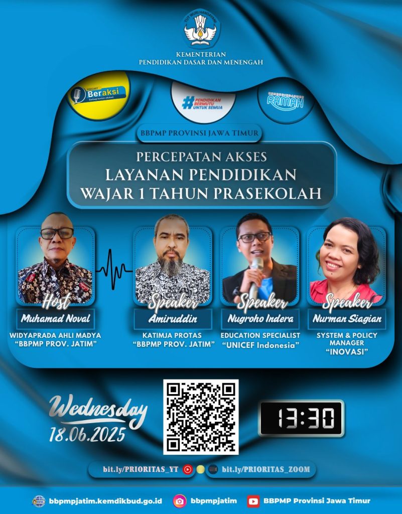 BBPMP Provinsi Jawa Timur menggelar kembali Podcast Beraksi (Berbagi Konten Edukasi) LIVE pada Rabu, 18 Juni 2025, pukul 13.30 WIB, guna membahas kebijakan nasional mengenai percepatan akses pendidikan prasekolah dalam kerangka program Wajib Belajar 13 Tahun.