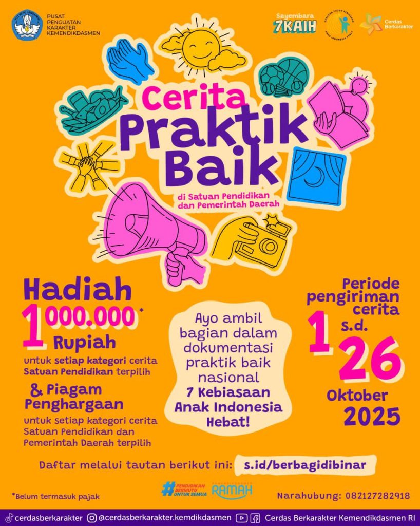 Untuk kategori “Cerita Praktik Baik,” satu karya terbaik dari setiap kategori satuan pendidikan akan memperoleh hadiah sebesar Rp1.000.000 (belum dipotong pajak) dan piagam penghargaan sebagai bentuk pengakuan atas praktik baik yang telah dilakukan.