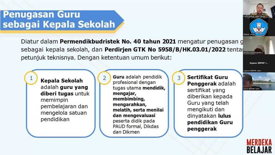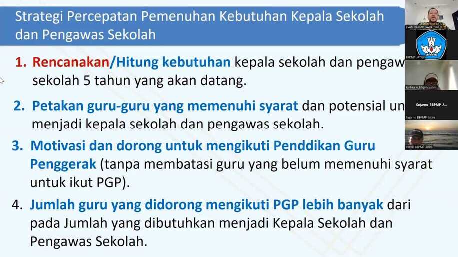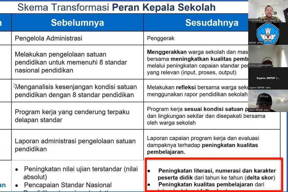 Hal tersebut turut dipaparkan oleh Penelaah Kebijakan Teknis BBPMP Provinsi Jawa Timur Evan Tjahja pada Rapat Persiapan Pelaksanaan Program Pengangkatan Guru Penggerak menjadi Kepala Sekolah dan Pengawas Sekolah di Jawa Timur tahun ini (Rabu, 24/1/2024) yang digelar Balai Besar Penjaminan Mutu Pendidikan (BBPMP) Provinsi Jawa Timur via zoom