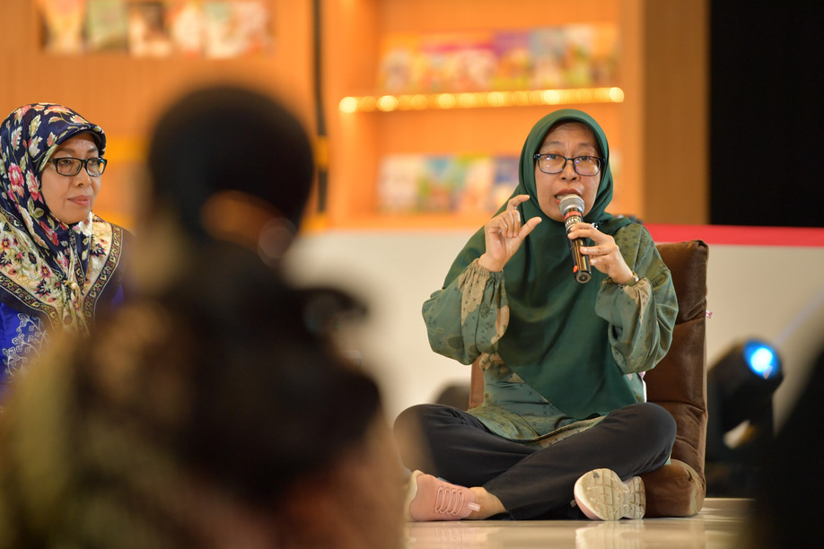 Sesi gelar wicara menghadirkan narasumber yang merupakan kurator buku-buku sastra untuk program Sastra Masuk Kurikulum, di antaranya penulis sastra Eka Kurniawan dan Abidah El Khaelieqy, serta guru Iin Indriyati.