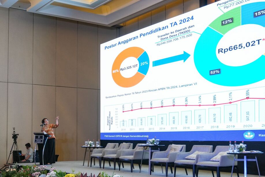 Pada tahun 2024, ujar Suharti, anggaran pendidikan mencapai Rp665 triliun, dialokasikan melalui Belanja Pemerintah Pusat, Transfer ke Daerah (TKD), alokasi dalam pos pengeluaran pembiayaan. “Kemendikbudristek mengelola anggaran sebesar Rp98,99 triliun atau sekitar 14,88 persen dari Anggaran Pendidikan. Untuk TKD, khususnya DAK Fisik untuk perbaikan sarana dan prasarana pendidikan, dan DAK Non Fisik seperti untuk bantuan operasional satuan pendidikan, tunjangan guru, Kemendikbudristek ikut terlibat dalam penetapan kebijakannya,” ucapnya.
