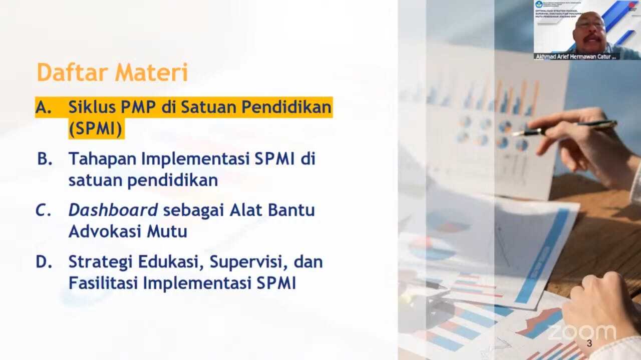 Dalam Kegiatan Optimalisasi Strategi Edukasi, Supervisi, dan Fasilitasi Penjaminan Mutu Pendidikan Jenjang SMP yang digelar secara daring melalui zoom dan siaran langsung YouTube, Balai Besar Penjaminan Mutu Pendidikan (BBPMP) Provinsi Jawa Timur menghadirkan Ahmad Arif Hermawan, pengawas SMP dari Kabupaten Probolinggo yang menyampaikan materi tentang siklus penjaminan mutu serta tahapan implementasi Sistem Penjaminan Mutu Internal (SPMI) di satuan pendidikan.